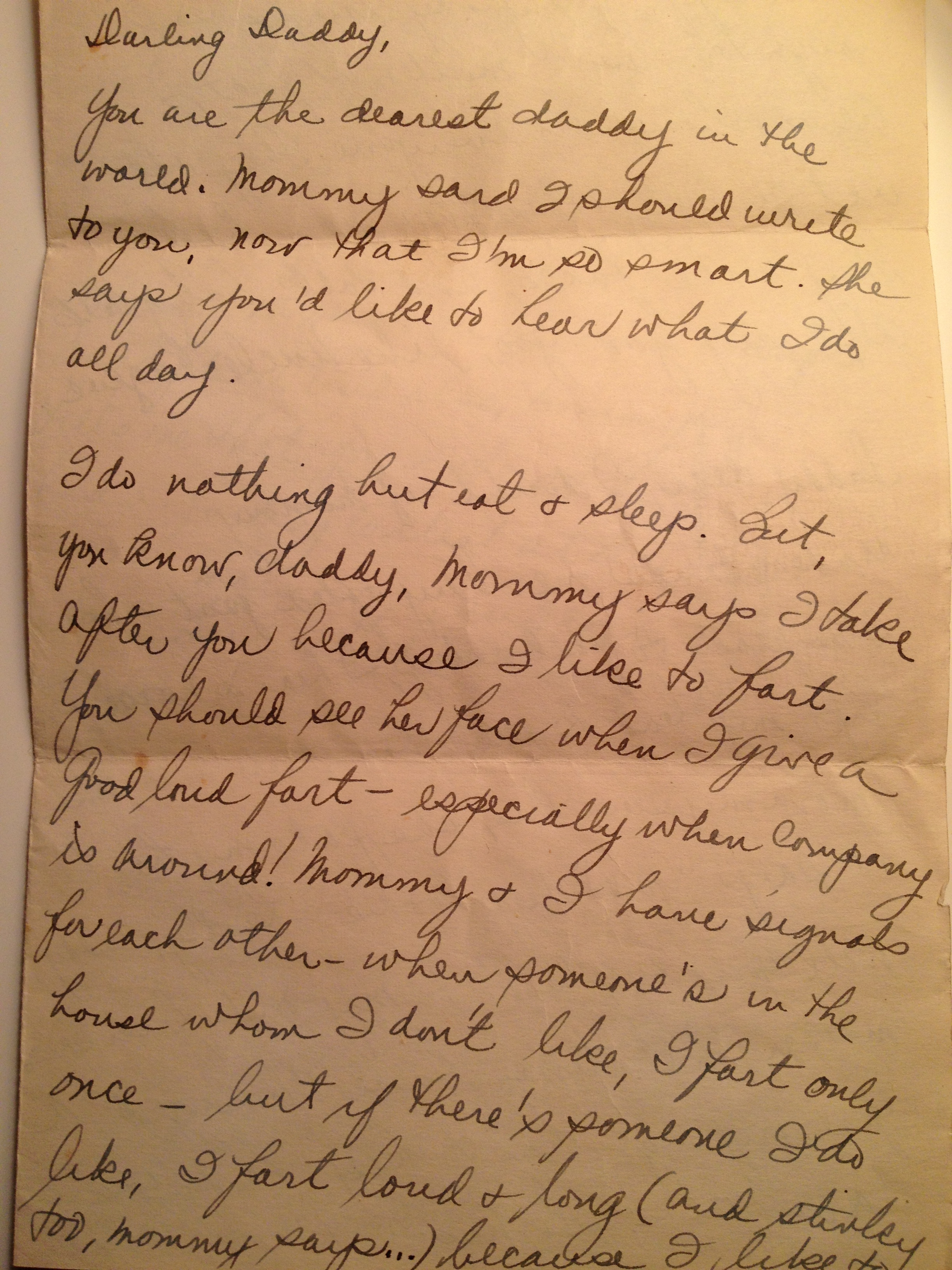 I’m very anxious to see if you’ve changed daddy dear. And also, mommy tells me that you and she once had a farting contest at three in the morning… and you won. But I bet I’ll win if you have one with me when you get home.