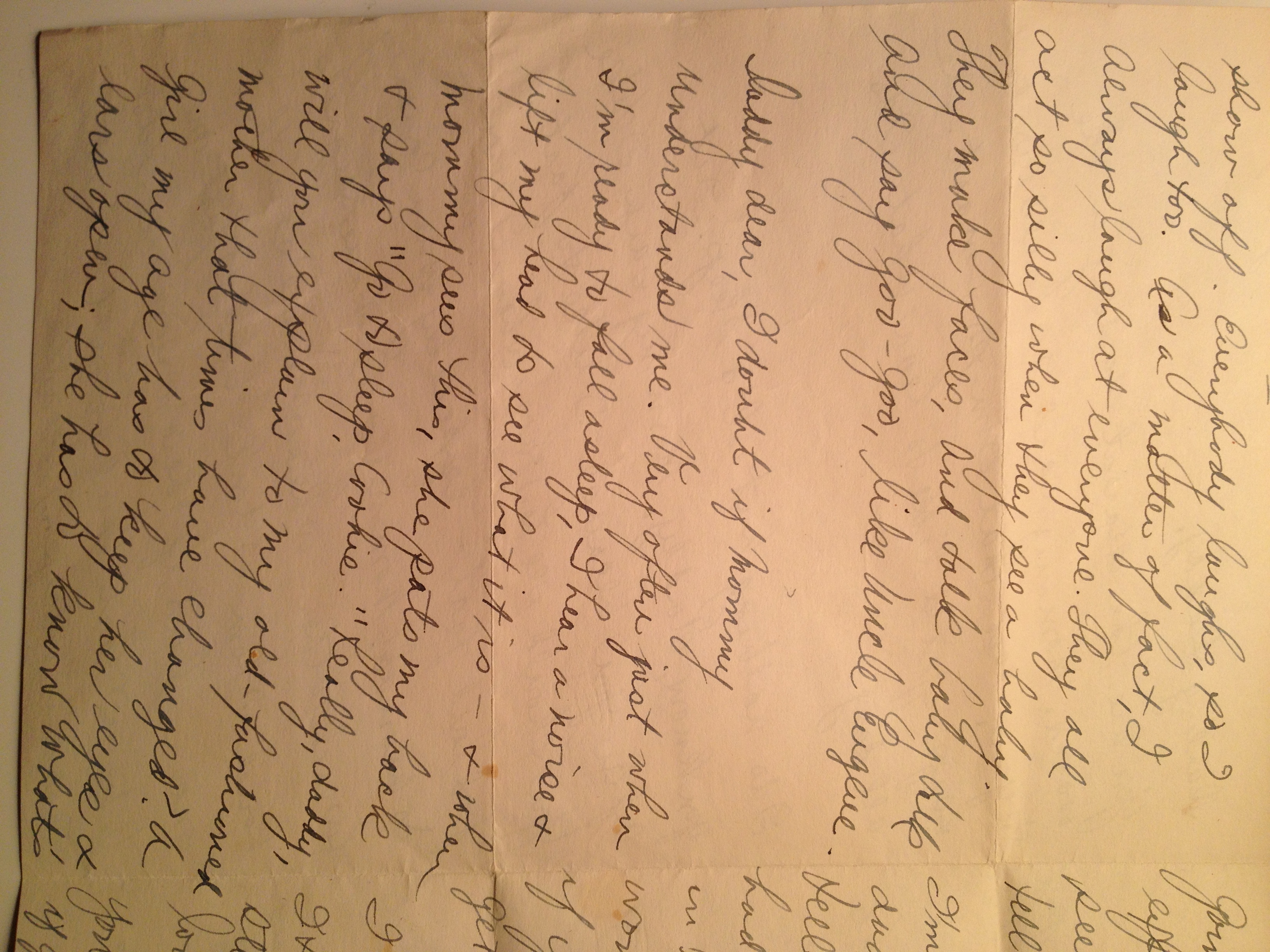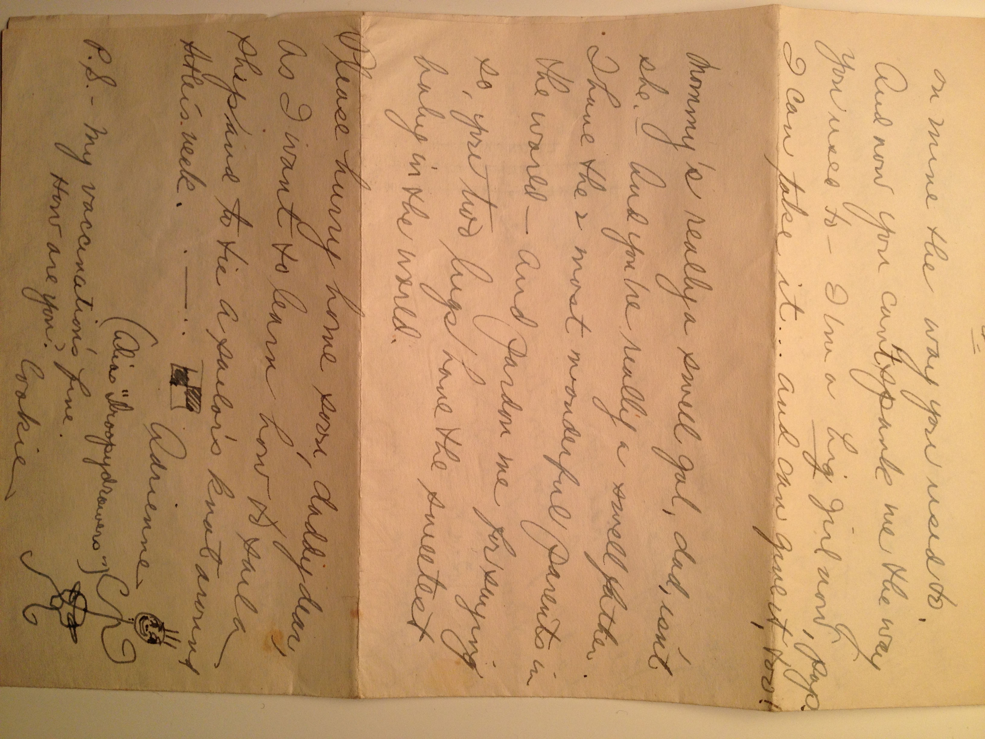 And now you can’t spank me the ways you used to – I’m a big girl now, pop. I can take it… and can give it, too! Mommy’s really a swell gal, dad, isn’t she. And you’re really a swell father. I have the 2 most wonderful parents in the world – and pardon me for saying so, you two have the sweetest baby in the world. Please hurry home soon, daddy dear, as i want to learn how to sail a ship and to tie a sailor’s knot around –(?)’s neck.