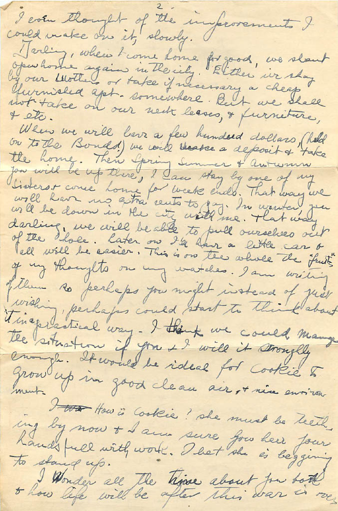 I have thought of the in improvements I could make on it, slowly. Darling, when I come home for good, we shan’t open home again in the city. Either we stay by our brothers mothers or take it if necessary a cheap furnished apartment somewhere. But we shall not take on our next lease, and furniture, and etc. When we will have a few hundred dollars, parentheses hold onto the bonds!) We will make a deposit and take the home. Then spring summer and autumn you will be up there, I can stay by one of my sisters and come home for the weekends. That way we will have no extra rents to pay. In winter, you will be down in the city with me. That way darling, we will be able to pull ourselves out of the hole. Later on I’ll have a little car and all will be easier. This is on the whole the “fruits” of my thoughts on the watches. I am writing of them so perhaps you might instead of just wishing, perhaps could start to think of it in a practical way.