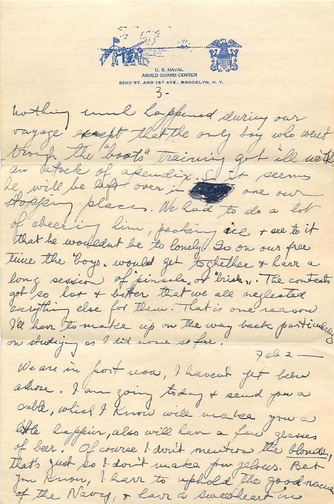 We are in Port now, I haven’t yet taken ashore. I am going today and send you a cable which I know will make you a little happier, also will have a few glasses of beer. Of course I don’t blonde that’s just so I don’t make you jealous. But you know, I have to uphold a good name of the Navy and have a sweetheart in every port!