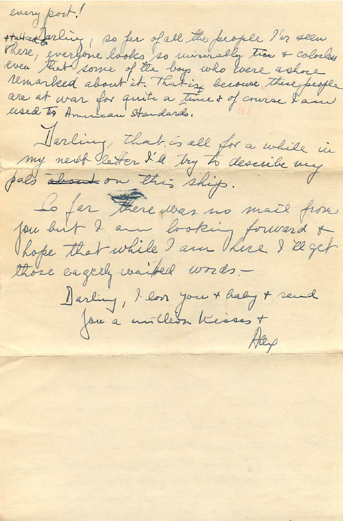 Darling, so far of all the people I’ve seen and talked to there, everyone looks so miserably tired and colorless even that some of the boys who were a sure remarked about it. That is because these people are at war for quite a long time and of course I am used to American standards. Darling, that is all for a while in my next letter I’ll try to describe my pals on this ship. So far there was no mail from you but I am looking forward and hope that while I am here I’ll get those eagerly weighted words. Darling, I love you and baby and send you a million kisses,