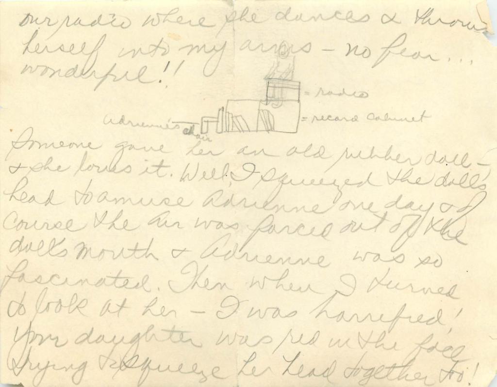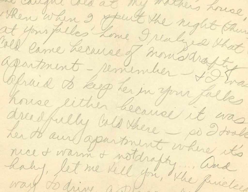 4 – She caught cold at my mother’s house, and then when I spent the night (Thurs) at your father’s home I realized that the cold came because of mom’s drafty apartment – remember – and I was afraid to keep her in your folks house either because it was dreadfully cold there – so I took her to our apartment where it’s nice and warm and not drafty… And baby, let me tell you, the quickest way to drive a person crazy is