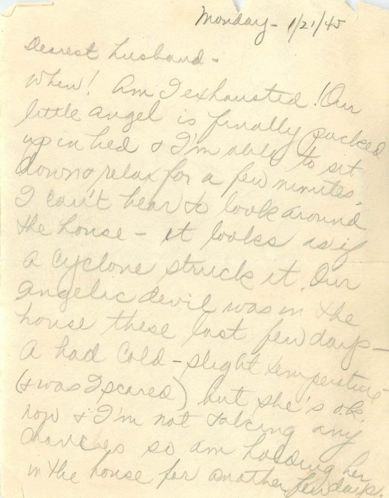 Whew! Am I exhausted! Our little angel is finally packed up in bed and I’m able to sit down and relax for a few minutes. I can’t bear to look around the house – it looks as if a cyclone struck it. Our angelic devil was in the house these last few days – A had cold – slight temperature – (and was I scared) but she’s o.k. now and I’m not taking any chances so am holding her in the house for another few days.