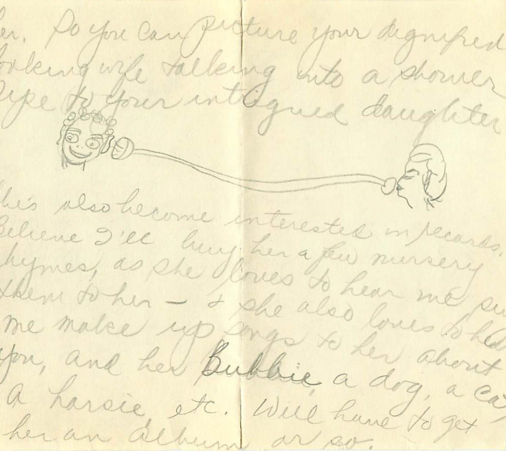 She’s also become interested in records. Believe I’ll buy her a few nursery rhymes, as she loves to hear me sing them to her – and she also loves to hear me make up songs to her about you, and her Bubbie a dog, a cat, a horsie, etc. Will have to get her an album or so.