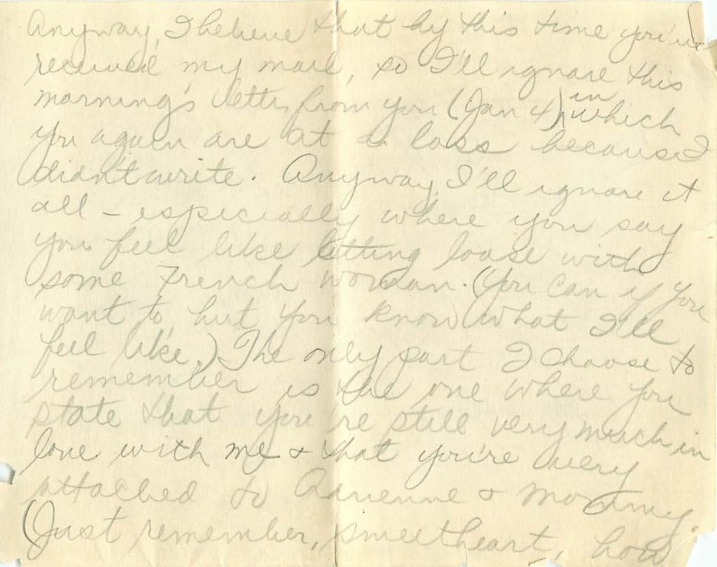 5 – Anyway, I believe that by this time you’ve received my mail, so I’ll ignore this morning’s letter from you (Jan 4) in which you again are at a loss because I didn’t write. Anyway, I’ll ignore it all – especially where you say you feel like letting loose with some French woman. (You can if you want to but you know what I’ll feel like.) The only part I choose to remember is the one where you state that you’re still very much in love with me and you’re very attached to Adrienne and Mommy. (Just remember, sweetheart, how