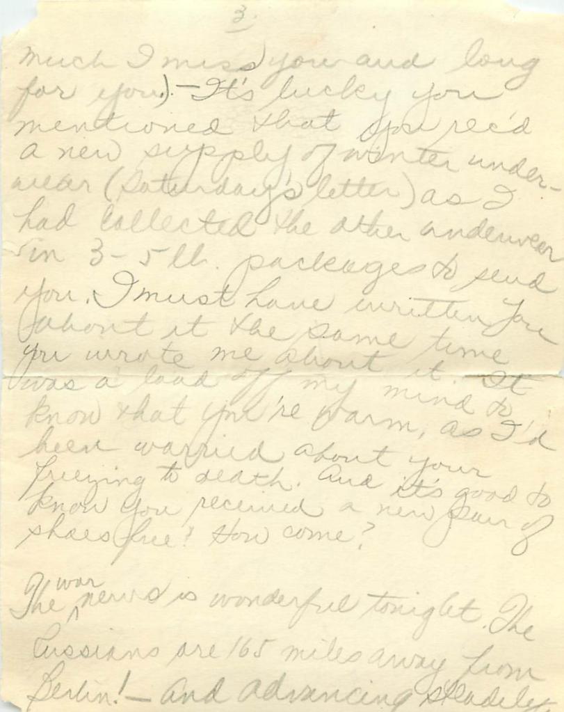 6 – much I miss you and long for you.) It’s lucky you mentioned that you rec’d a new supply of winter underwear (Saturday’s letter) as I had collected the other underwear in 3-5 lb packages to send you. I must have written you about it the same time you wrote me about it. It was a load off my mind to know that you’re warm, as I’d been worried about your freezing to death. And it’s good to know you received a new pair of shoes free! How come?