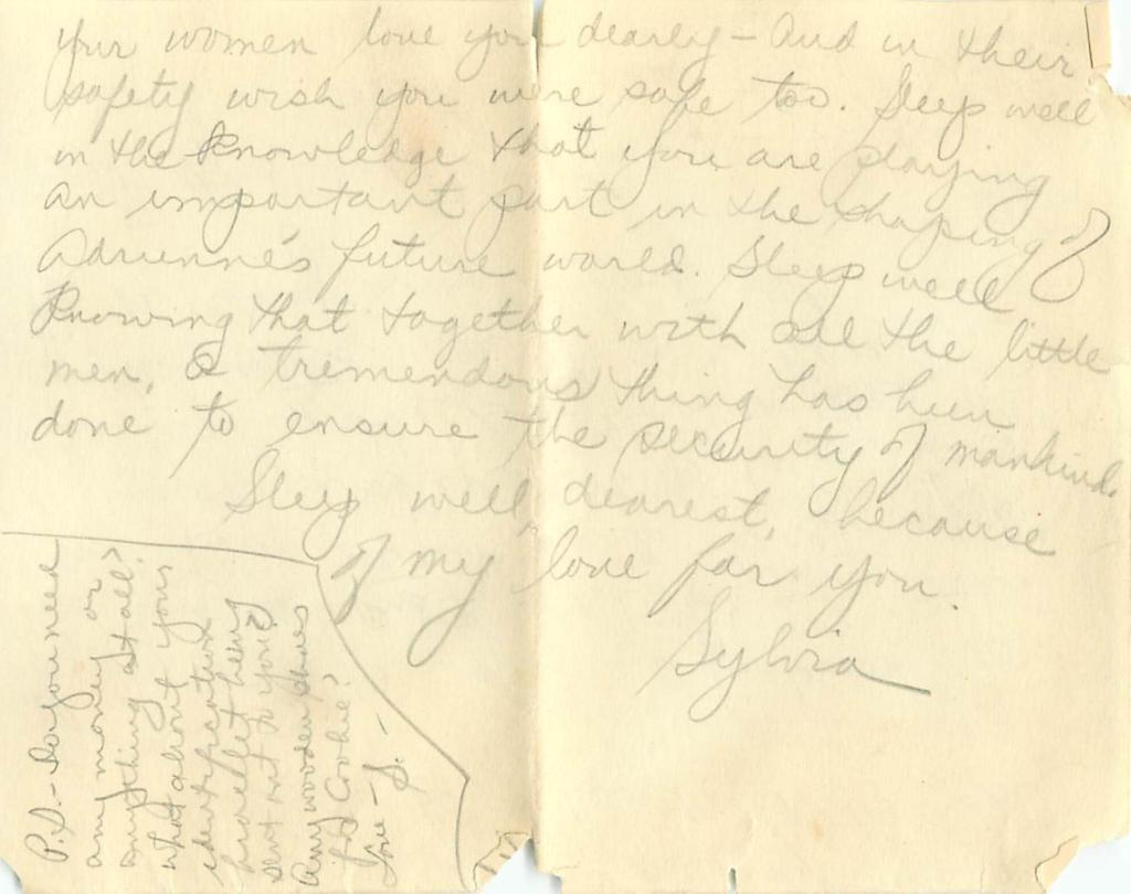 9 – your women love you dearly – and in their safety wish you were safe too. Sleep well in the knowledge that you are playing an important part in the shaping of Adrienne’s future world. Sleep well knowing that together with all the little men, a tremendous thing has been done to ensure the security of mankind. Sleep well, dearest, because of my love you for you.