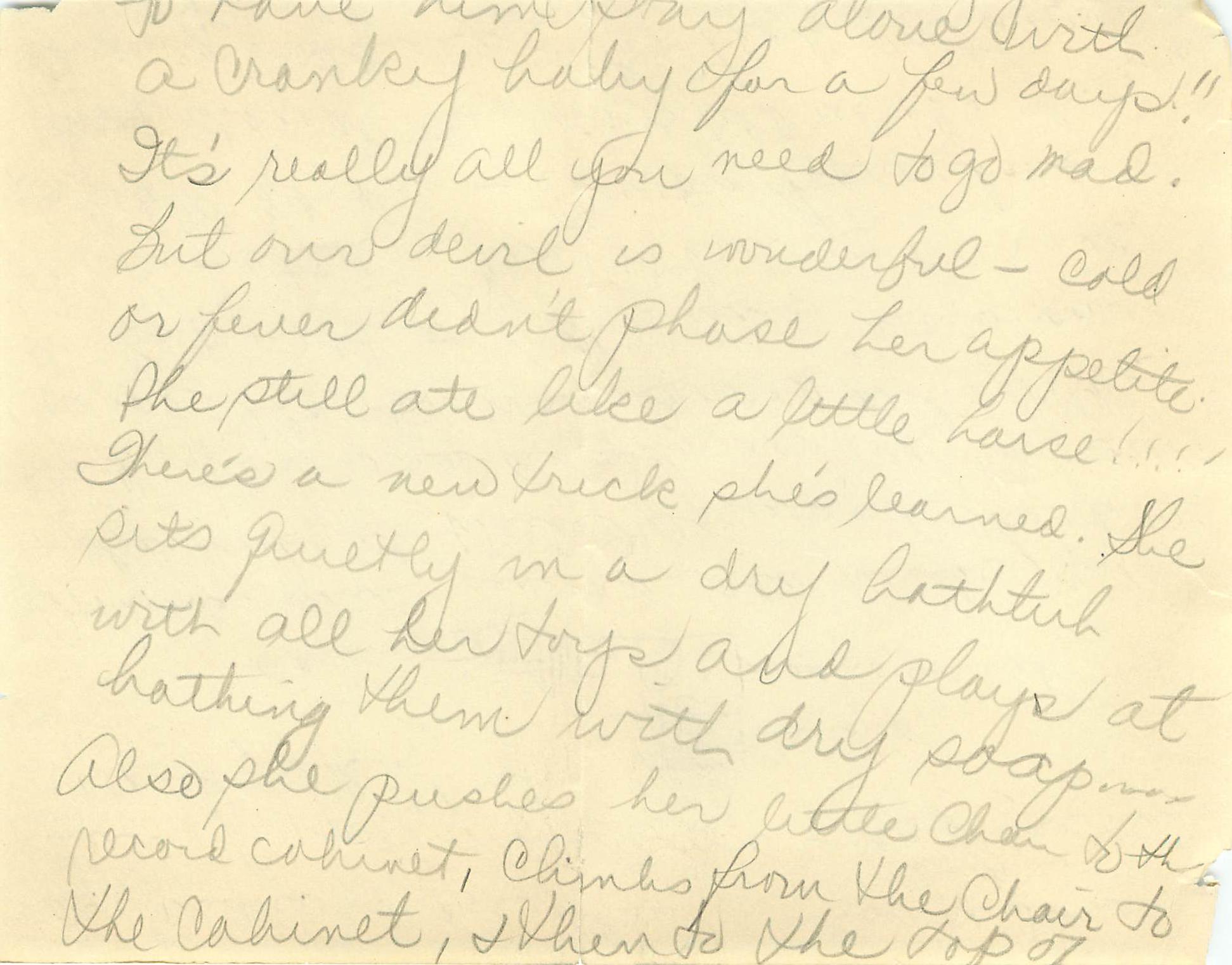 Whew! Am I exhausted! Our little angel is finally packed up in bed and I’m able to sit down and relax for a few minutes. I can’t bear to look around the house – it looks as if a cyclone struck it. Our angelic devil was in the house these last few days – A had cold – slight temperature – (and was I scared) but she’s o.k. now and I’m not taking any chances so am holding her in the house for another few days.