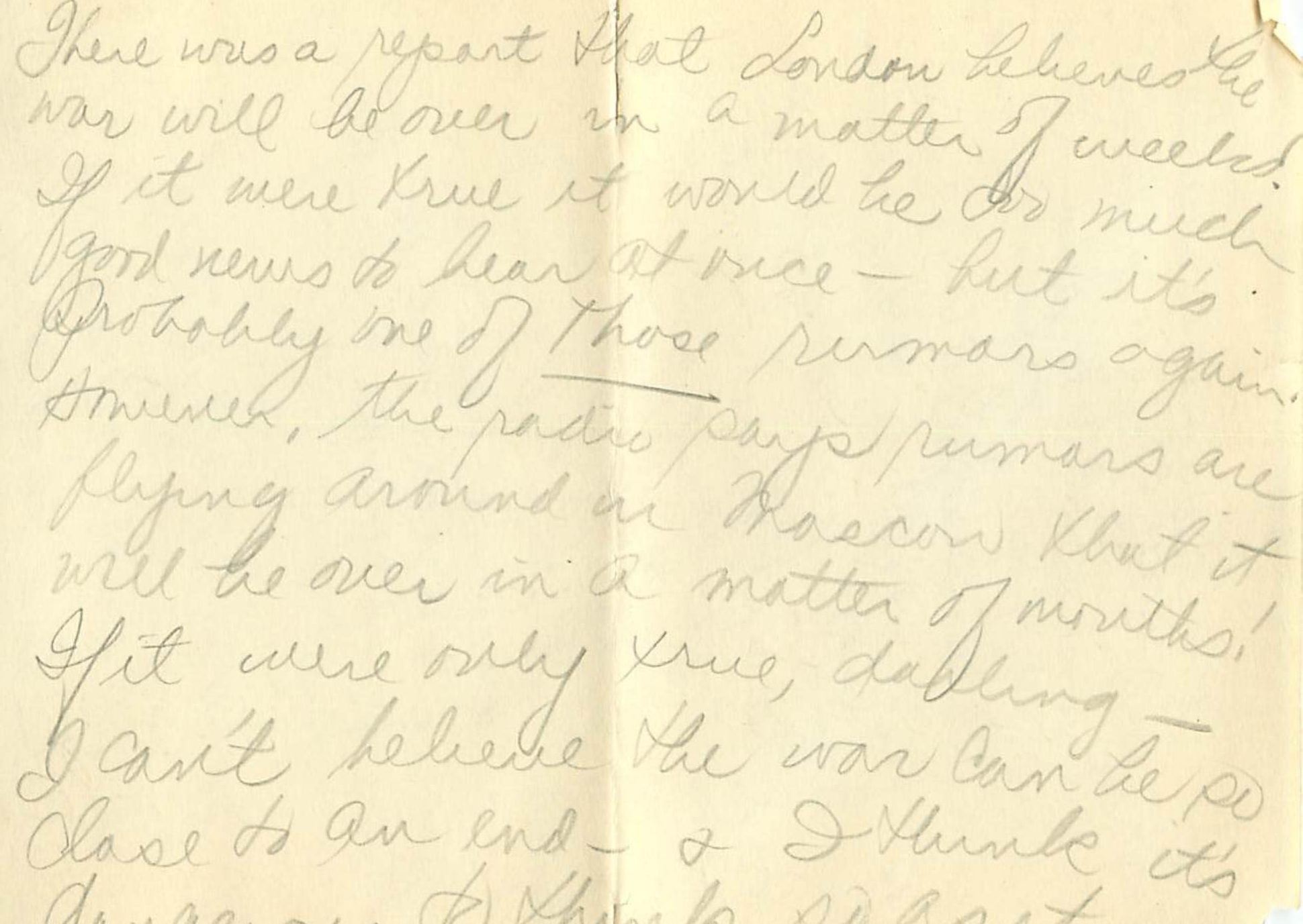 7 – There was a report that London believes the war will be over in a matter of weeks! If it were true it would be too much good news to hear at once – but it’s probably one of those sermons again. However, the radio says rumors are flying around — that it will be over in a matter of months! If it were only true, darling – I can’t believe the war can be so close to an end – and I think it’s dangerous to think so as it