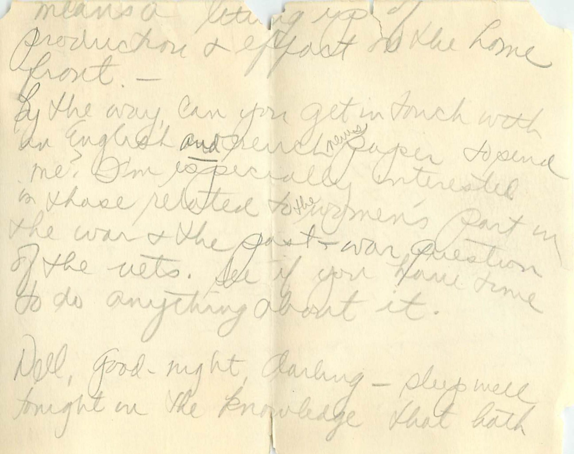 By the way, can you get in touch with an English and French newspaper to send me? I’m especially interested in those related to the women’s part in the war and the past- war question of the vets. See if you have time to do anything about it.