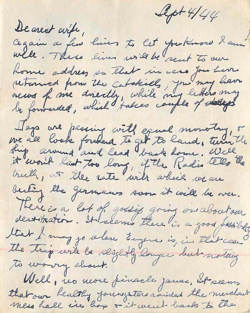 Mike the P.O. of whom I spoke in some of my previous letters has seen some action in the past and if an alarm goes off or the anchor hits the side of the ship he yells and runs. Yesterday we had a fire and boat drill. I was just nocking [sic] off a little sleep when the alarm [sic] went off. One of the boys an old timer started to yell “that’s it,” I half asleep in my skivvy and pants and only socks, on my feet jumped off my bunk and ran like hell to my station thinking it was the
