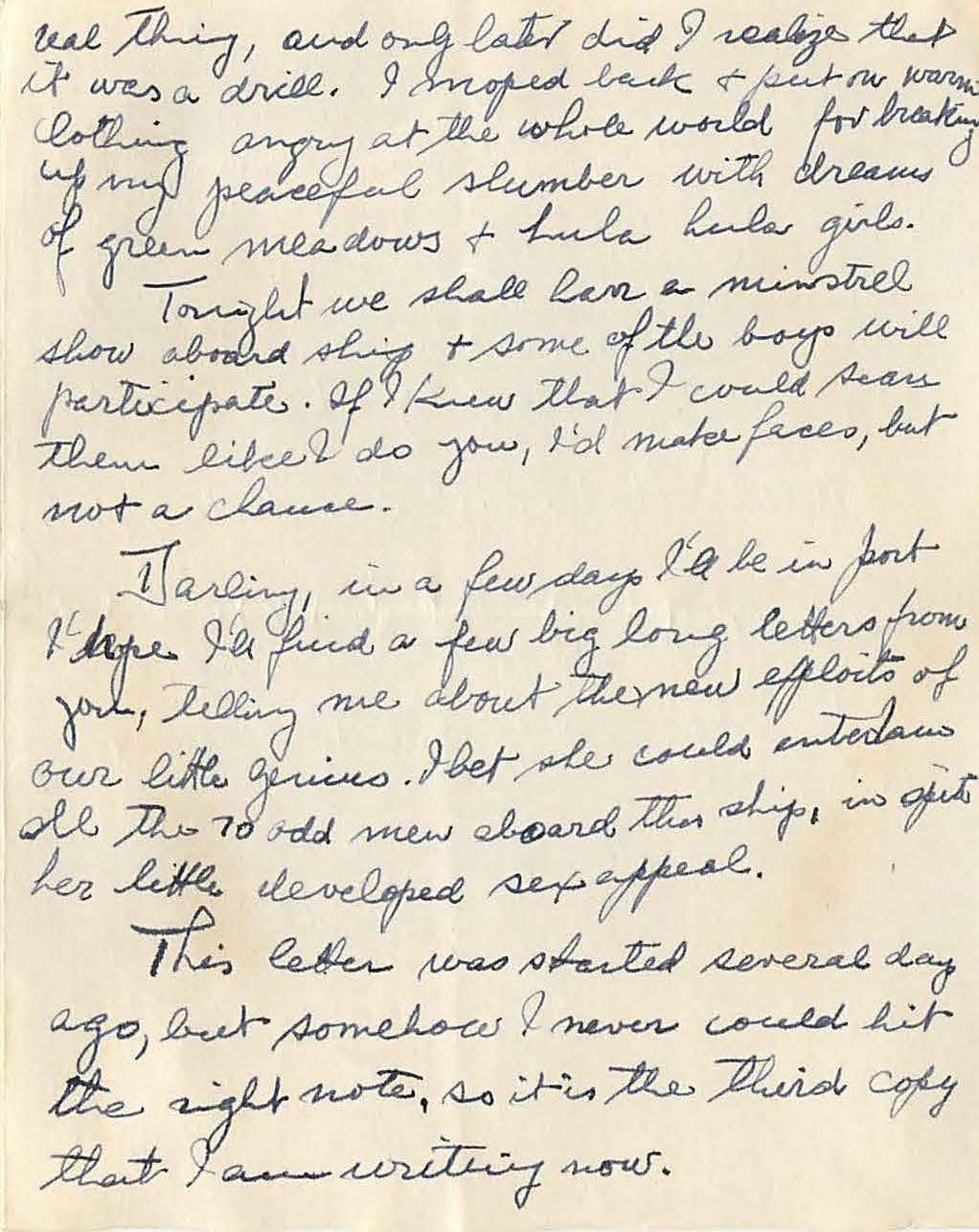 Darling, in a few days I’ll be in port I hope I’ll find a few big long letters from you, telling me about the new efforts of our little genius. I bet she could entertain(?) all the 70 odd men aboard this ship, in spite her little developed sex appeal.