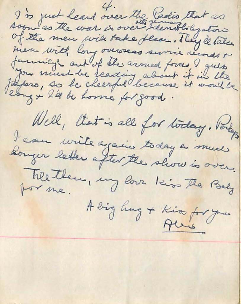 I’ve just heard over the Radio that as soon as the war is over with Germany demobilization of the men will take place. They’ll take men with long overseas service records and family’s [sic] out of the armed forces I guess you must be reading about it in the papers, so be cheerful because it wouldn’t be long and I’ll be home for good.
