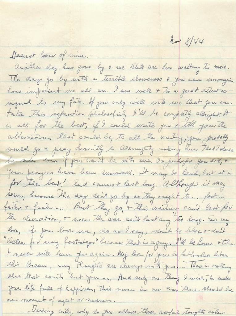 Another day has gone by and we still are here waiting to move. The days go by with a terrible sloweness [sic] and you can imagine how impatient we all are. I am well and to a great extent resigned to my fate. If you only will write me that you can take this separation philosoficly [sic] I’ll be completely alright. It is all for the best, if I could write you and tell you the alternatives that could be, to all this waiting, you probably would go and pray fervently to almighty asking him that I should be safe even if you can’t be with me. Or perhaps you did, and your prayers have been answered. It may be hard, but it is for the best! And cannot last long. Although it may seem, because the days don’t go by as they ought to…. fast… faster and faster… But they go, and this waiting can’t last for the duration and even the war can’t last any too long. So my love, if you love me, do as I say, don’t’ be blue and don’t “listen for my footsteps” because that is agony. I’ll be home and then I never will leave you again. My love for you is fathomless? like this dream?, my thoughts are always with you… There is nothing else that counts but you… And only one thing I wish, to make your life full of happiness, that never in our lives there should be one moment of regret or sadness.