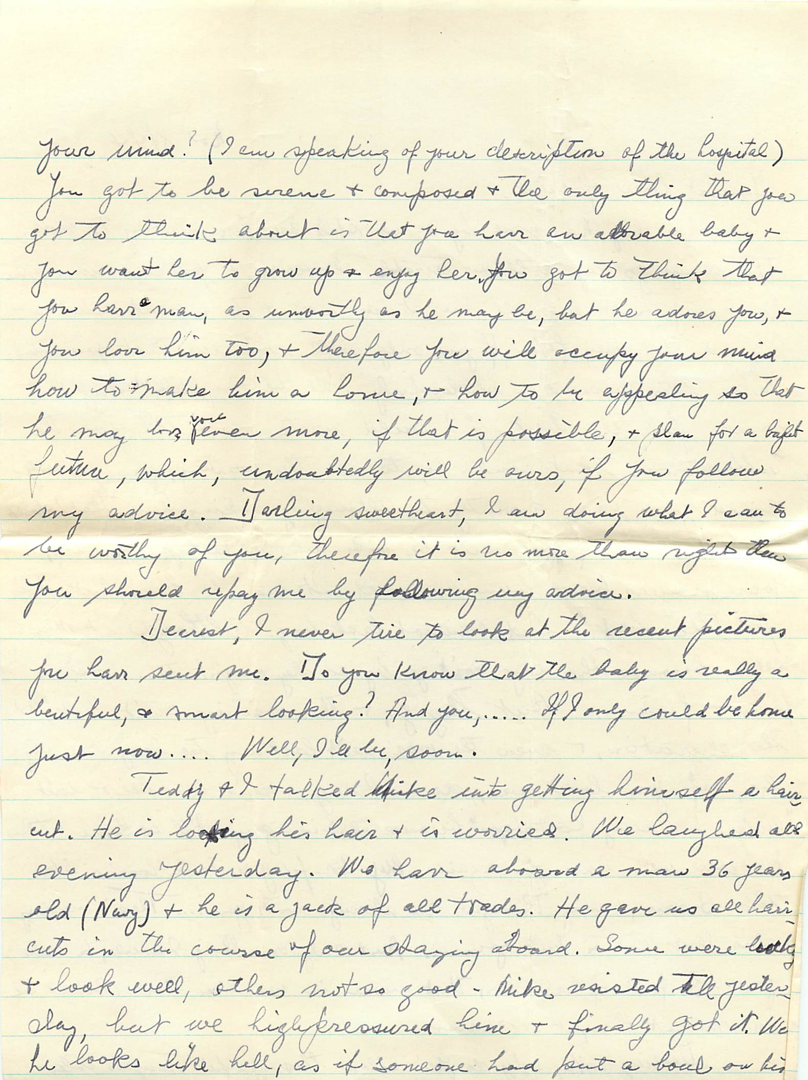 your mind? (I am speaking of your description of the hospital). You got to be serene and composed and the only thing that you got to think about is that you have an adorable baby and you want her to grow up and enjoy her. You got to think that you have a man, as un–ly(?) as he may be, but he adores you, and you love him too, and therefore you will occupy your mind how to make him a home, and how to be appealing so that he may love you even more, if that is possible, and plan for a bright future, which, undoubtedly will be ours, if you follow my advice. Darling sweetheart, I am doing what I can to be worthy of you, therefore it is no more than right that you should repay me by following my advice.
