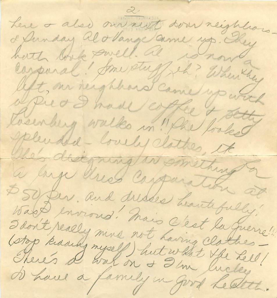Here and also our next door neighbors and Sunday Al and Vange (?) came up. They both look swell. Al is now a corporal! Some stuff, eh? When they left, our neighbors came up with a pie and I made coffee and Better Lasenberg walks in!! She looked splendid – lovely clothes, etc. She’s designing or something for a large dress corporation at $50 per and dresses beautifully! Was I envious! Mais c’est la guerre [but that’s the war] I don’t really mind not having clothes – (stop kidding myself) but what the hell! There’s a war on and I’m lucky to have a family in good health.