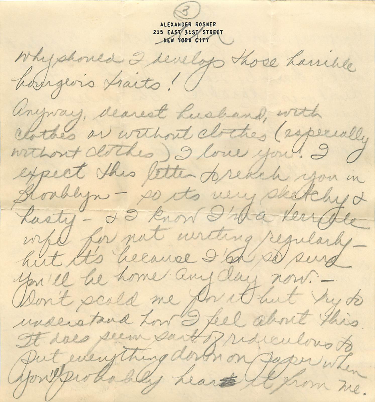 Anyway, dearest husband, with clothes or without clothes (especially without clothes) I love you! I exepect this letter to reach you in Brooklyn – so its very sketchy and hasty – and I know I’m a terrible wife for not writing regularly but it’s because I’m so sure you’ll be home any day now. –