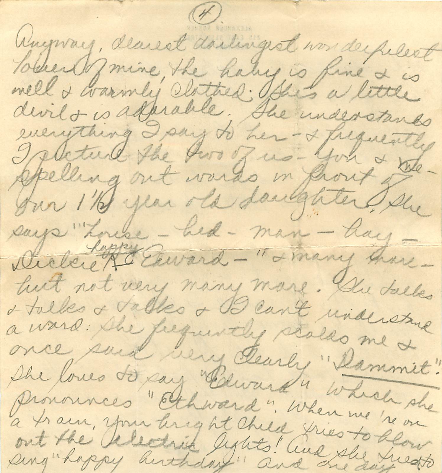 Anyway, dearest, darlingest, wonderfulest, lover of mind, the baby is fine and is well and warmly clothed. She’s a little devil and adorable. She understands everything I say to her – and frequently I picture the two of us – you and me spelling out words in front of our 1 ½ year old daughter. She says “house (?) – bed – man – bay – Dickie – happy – Edward –“ and many more but not very many more. She talks and talks and talks and I can’t understand a word. She frequently scolds me and once said very clearly “Dammit” she loves to say “Edward” which she pronounces “Ethward.” When we’re on a train, your bright child tries to blow out the electric lights! And she tried to sing “happy birthday” and one day