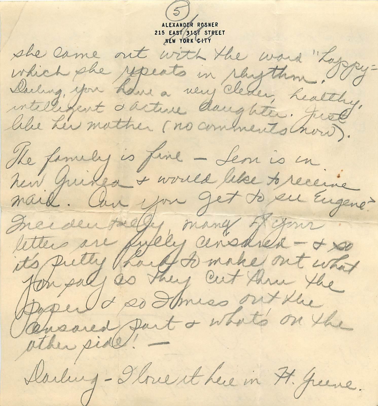 The family is fine – Leon is in New Guinea and would like to receive mail. Can you get to see Eugene? Incidentally, many of your letters are fully censored – and so it’s pretty hard to make out what you say as they cut thru the paper and so I miss out the censored part and what’s on the other side!
