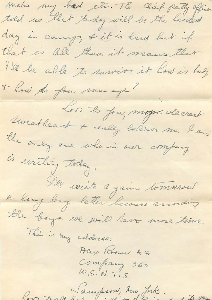 Today I’m sharing this short letter that Alex sent the first day he arrived at his training near Lake Geneva. He notes that no one else is writing a letter and he is exhausted. It seems like it was mailed the same day as the letter I will post tomorrow in which he mentions they didn’t have a mailman assigned yet. These are the letters Sylvia responded to in the previous post, noting that she received two letters in a day and was delighted.
