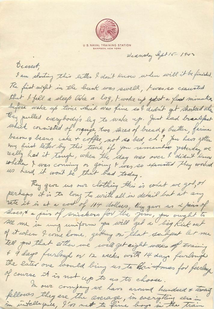 I am starting this letter I don’t know when it will be finished. The first night in the bunk was swell, I was so exhausted taht I fell asleep like a log, I woke up just a few minutes before wake up time which was fine so I didn’t get shocked when they pulled everybody’s leg to wake up. Just had breakfast which consisted of orange, two slices of bread and butter, farina, bacon and beans cake and coffee, not so bad, eh? You have gotten my first letter by this time, if you remember yesterday we really had it tough, when they day was over I didn’t know whether was coming or going and was so exhausted they worked us hard it won’t be that bad today.