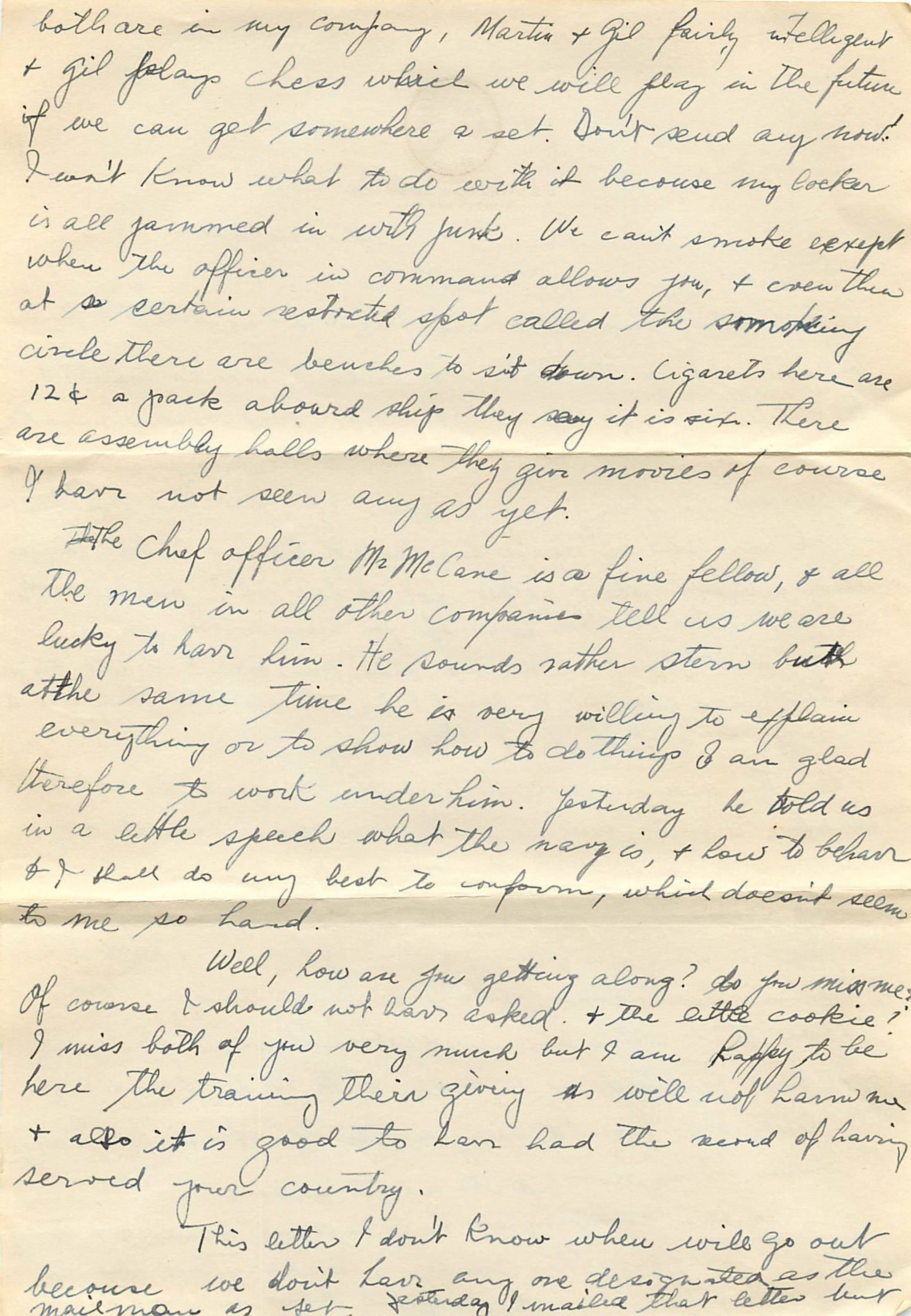Both are in my company, Martin and Gil, fairly intelligent and Gil plays chess which we will play in the future if we can get somewhere a set. Don’t send any now! I won’t know what to do with it because my locker is all jammed in with junk. We can’t smoke except when the officer in common allows you, and even then at a certain restricted spot called the smoking circle there are benches to sit down. Cigarets here are 12c a pack aboard ship they say it is six. There are assembly halls where they give movies of course I have not seen any as yet.