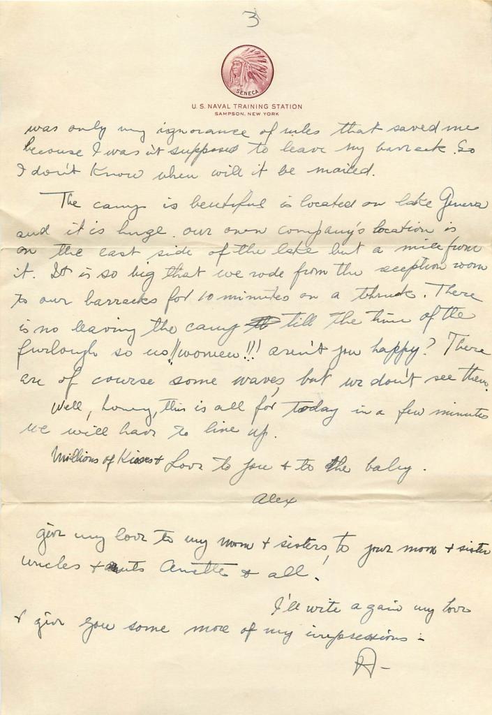 Alex has just arrived at his camp and gotten settled in. He states so bluntly, “In our company we have around hundred and twenty fellows. They are the average, in everything also in intelligence.” But talks about two new pals of his and has a fairly optimistic outlook through the whole letter. “I miss both of you very much but I am happy to be here. The training their [sic] giving us will not harm me and also it is good to have had the record of having served your country. ” It’s interesting that he says it’s good to have a record of serving, rather than it is good to have served. Although he was just in training and he was sounding almost boy-ish and eager in this optimistic letter, he was already thinking about life after the war.