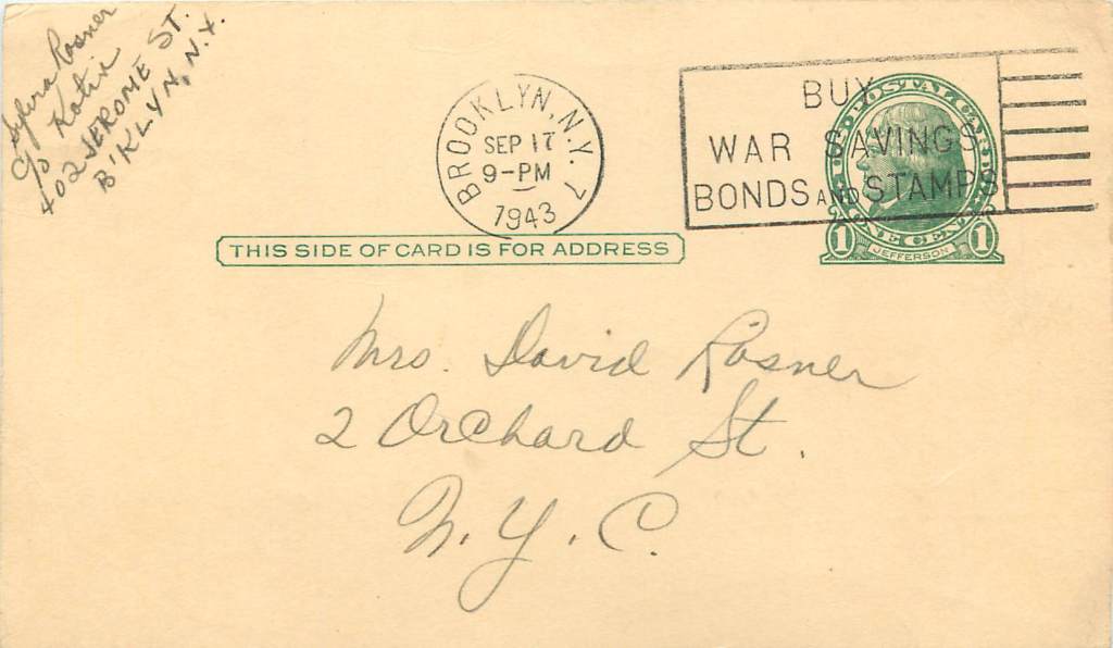 After Sylvia received Alex’s first letters she wrote a short postcard to his mother (who she calls mom). She addresses it to Mrs. David Rosner, Alex’s dad (and what he named his son, my dad).