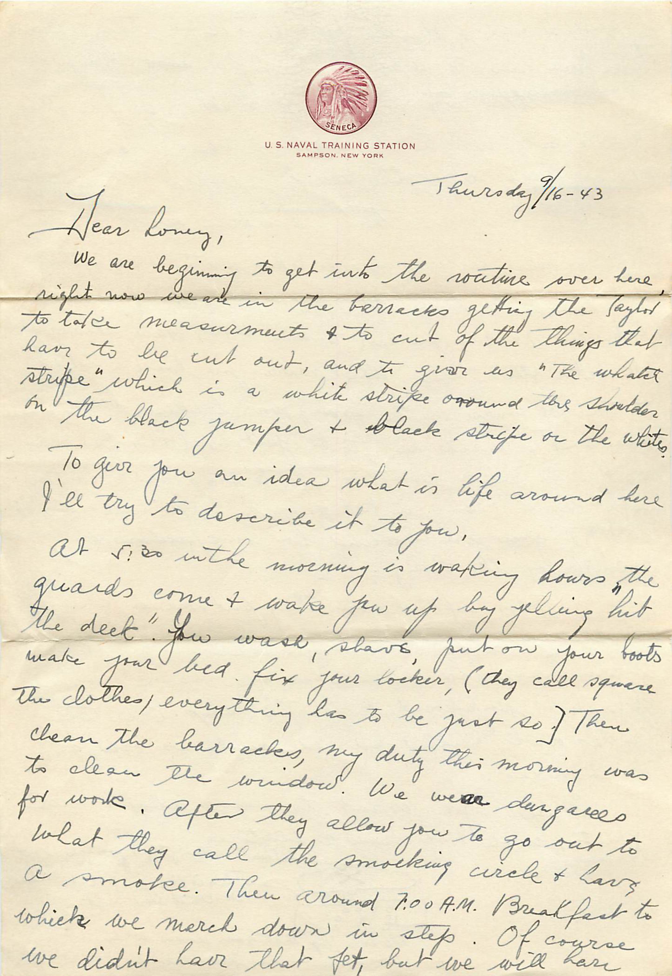 At 5:00 in the morning is waking hours the guards come and wake you up by yelling “hit the deck”. You wash, shave, put on your boots make your bed, fix your locker (they call square the clothes, everything has to be just so.] Then clean the barracks, my duty this morning was to clean the window. We wear dungarees for work. After they allow you to go out to what they call the smoking circle and have a smoke. Then around 7:00AM Breakfast to which we merch down in step. Of course we didn’t have that yet, but we will have callistenics and drills from 8 to 12:30 than lunch than from 1:30 to 4:30 drill. After change of clothes either into whites or blacks so far there were no white to wear of which we are very happy because of the washing problem. Then around 5:30PM supper. Then smoking, or going to the canteen, lectures movies letter writing and everything that has to be done. At 9:30 lights out of course between 7 and 9:00 you have to shine shoes, wash, shower and all little other things. What makes you loose a lot of time of course is the finding your lockers, because everything that is inside has to be just so, (this has been written in the morning I had to stop now it is ten after nine I am in bed and will write till lights out) and you are bound for inspection any minute of the day.