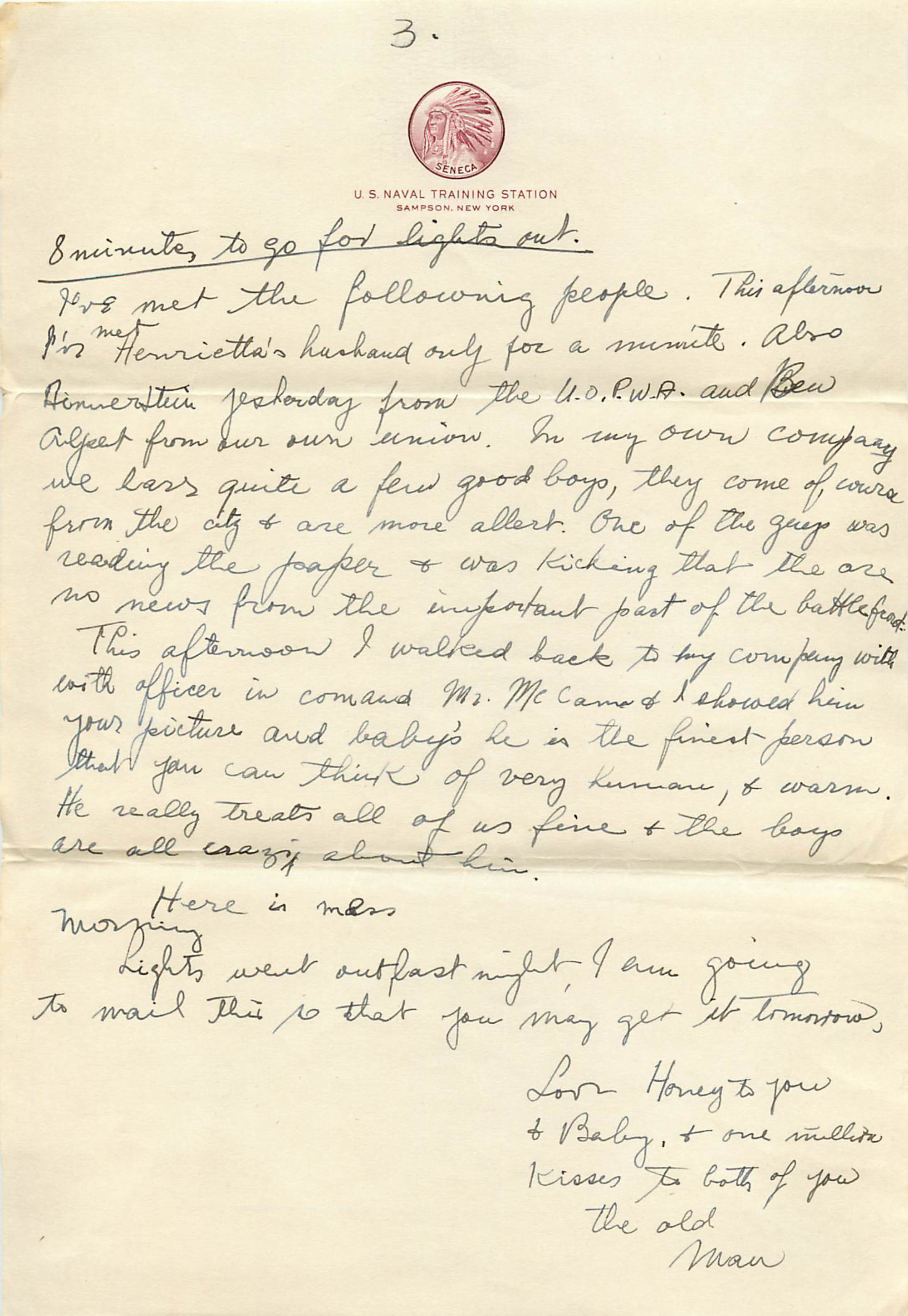 This afternoon I walked back to my company with officer in command Mr. McCaine and I showed him your picture and baby’s. He is the finest person that you can think of very human, and warm. He really treats all of us fine and the boys are all crazy about him.