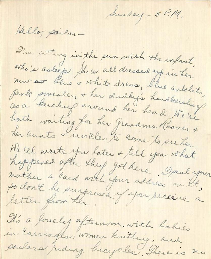 I’m sitting in the sun with the infant who’s asleep. She’s all dressed up in her new blue and white dress, blue anklets, pink sweater and her daddy’s handkerchief as a kerchief around her head. We’re both waiting for her grandma Rosner and her aunts and uncles to come to see her. We’ll write you later and tell you what happened after they got here. I sent your mother a card with your address on it, so don’t be surprised if you receive a letter from her.