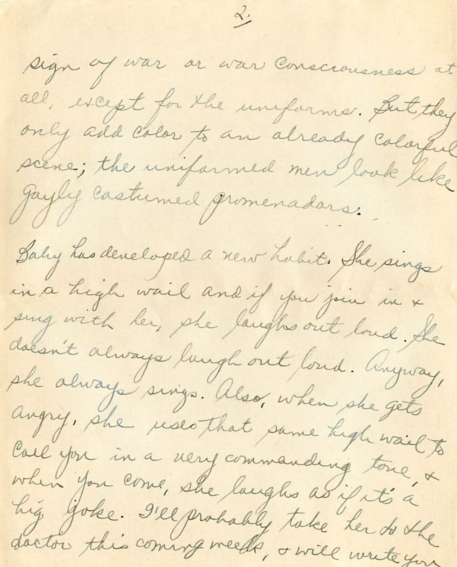 Sylvia is waiting with Adrienne for Alex’s parents and siblings to arrive. Adrienne is all dressed up for the occasion and this letter is mostly her idle observations of the scene around her. She makes up a little song, she talks about the uniformed men walking around, and mentions that it hardly feels like there is a war going on at all. A woman next to her is telling dirty jokes (which I’m surprised didn’t make it into the letter.) She starts the letter at 3PM and closes it at 4PM saying the family has still not arrived. There are additional pages that she added later, after their visit, that will be in the next post. Sylvia sounds a bit bored and says she is being a good wife, not doing anything. Though she also mentions with some pride that she’s arguing with people around her and winning those arguments.