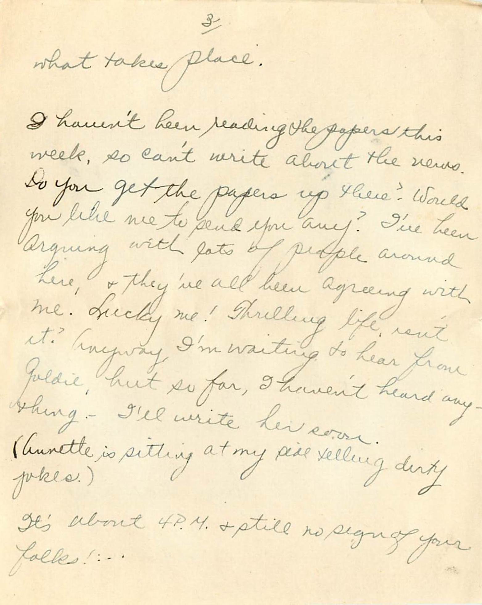 I haven’t been reading the papers this week, so can’t write about the news. Do you get get the appears up there? Would you like me to send you any? I’ve been arguing with lots of people around here, and they’ve all been agreeing with me. Lucky me! Thrilling life, isn’t it? Anyway, I’m waiting to hear from Goldie, but so far, I haven’t heard anything – I’ll write her soon. (Annette is sitting at my side telling dirty jokes.) It’s almost 4PM and still no sign of your folks! …