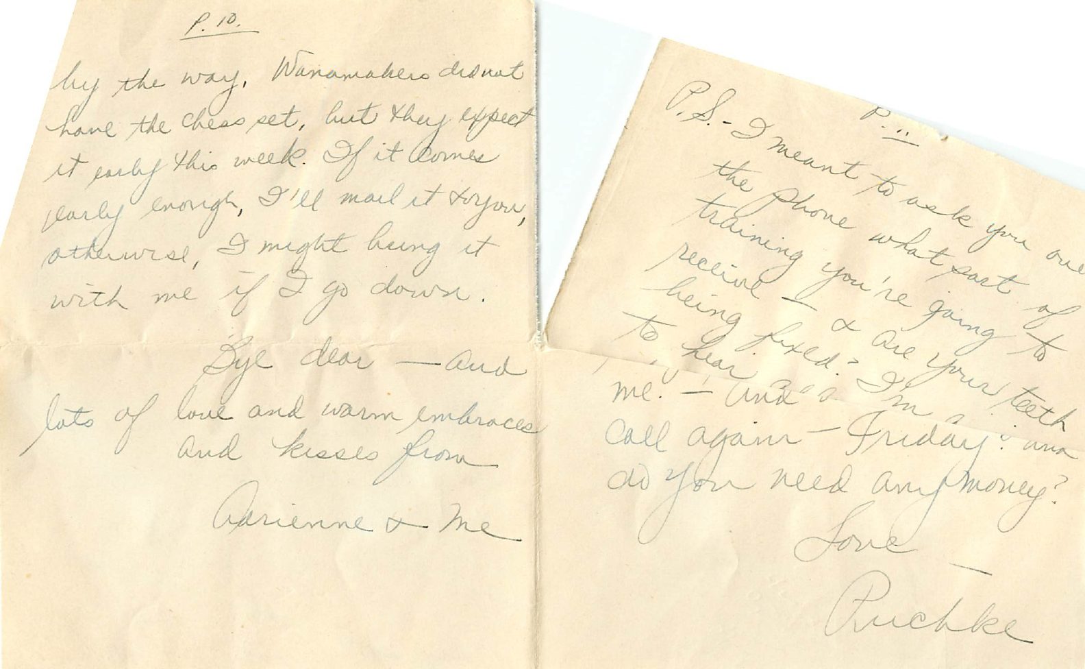 P.S. I meant to ask you over the phone what part of training you’re doing to receive – and are your teeth being fixed? I’m [page wrinkled] call again Friday? And od you need any money?