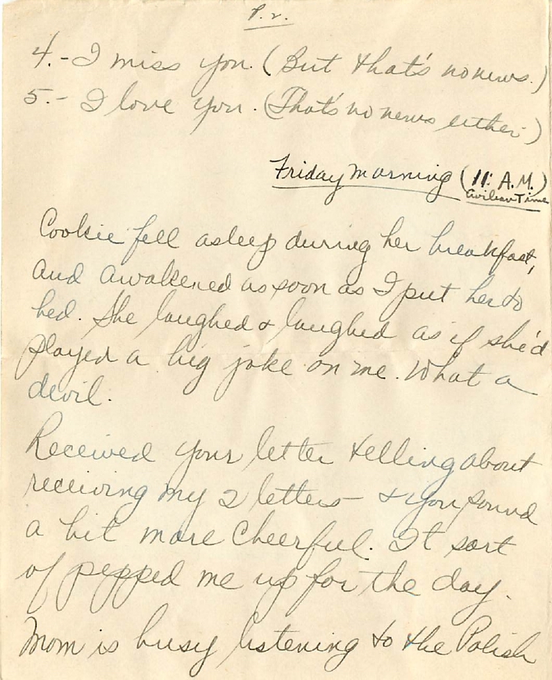 Received your letter telling about receiving my 2 letters and you sound a bit more cheerful. It sort of pepped me up for the day. Mom is busy listening to the Polish news.