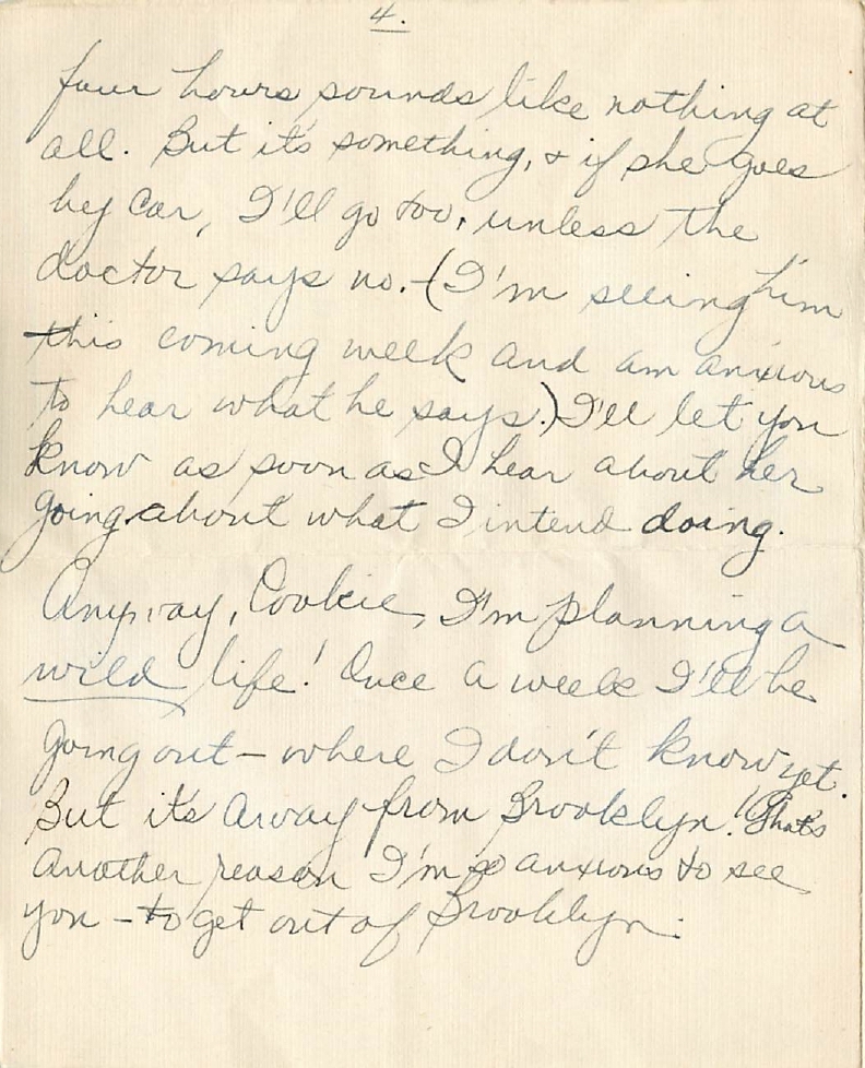 Anyway, Cookie, I’m planning a wild life! Once a week I’ll be going out – where I don’t know yet. But it’s away from Brooklyn! That’s another reason I’m so anxious to see you – to get out of Brooklyn.