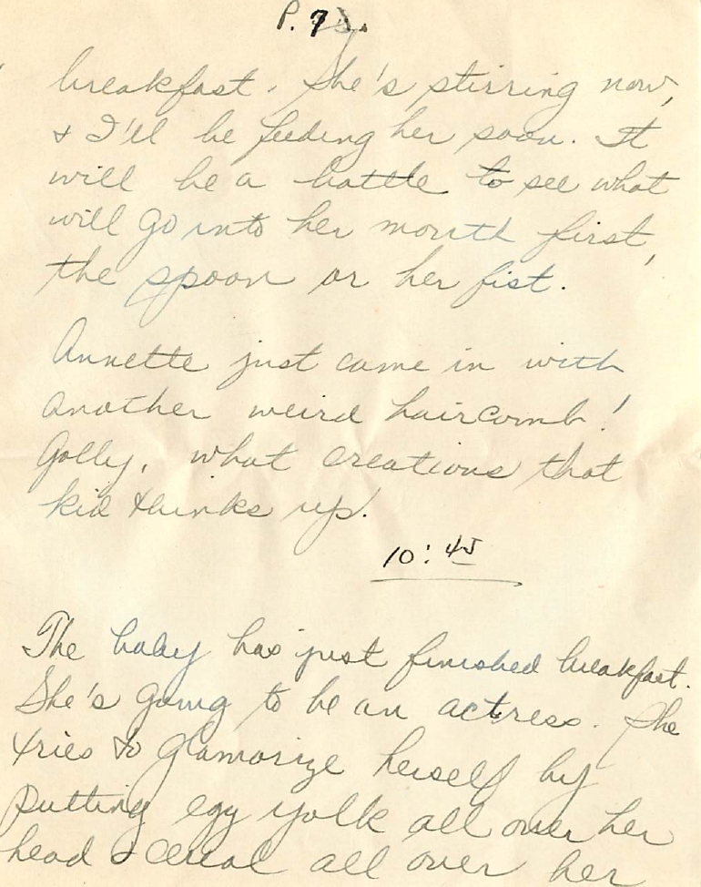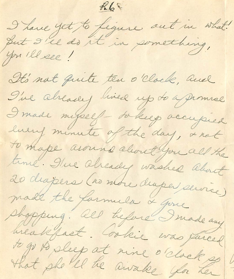 This letter is written over the course of 3 days, with updates from Sylvia as she goes about taking care of Adrienne and filling Alex in on her activities. She’s so cheeky in the letter, she mentions how stern Alex sounded on the phone – making her want to respond to him “yes sir.” She says she’s not going to be a yes-woman to him anymore, though she doesn’t yet know how – exactly – she’s going to disobey his orders. The joy she gets from Adrienne is so beautiful to read, even as we get a peek at how labor intensive motherhood – especially in the 1940s – was. She is making formula and scalding herself on the hot water, she is washing out diapers by hand, and trying to time Adrienne’s naps just right. I only wish I’d gotten through more of these letters while my aunt was here to read about how deeply loved she was. (The guilt I feel about this can at times make it hard to continue this project.) Sylvia delights in things only a mother could, “She’s calling me now – and screaming in the sheer joy of moving her bowels. What a joy she is! I love her!”