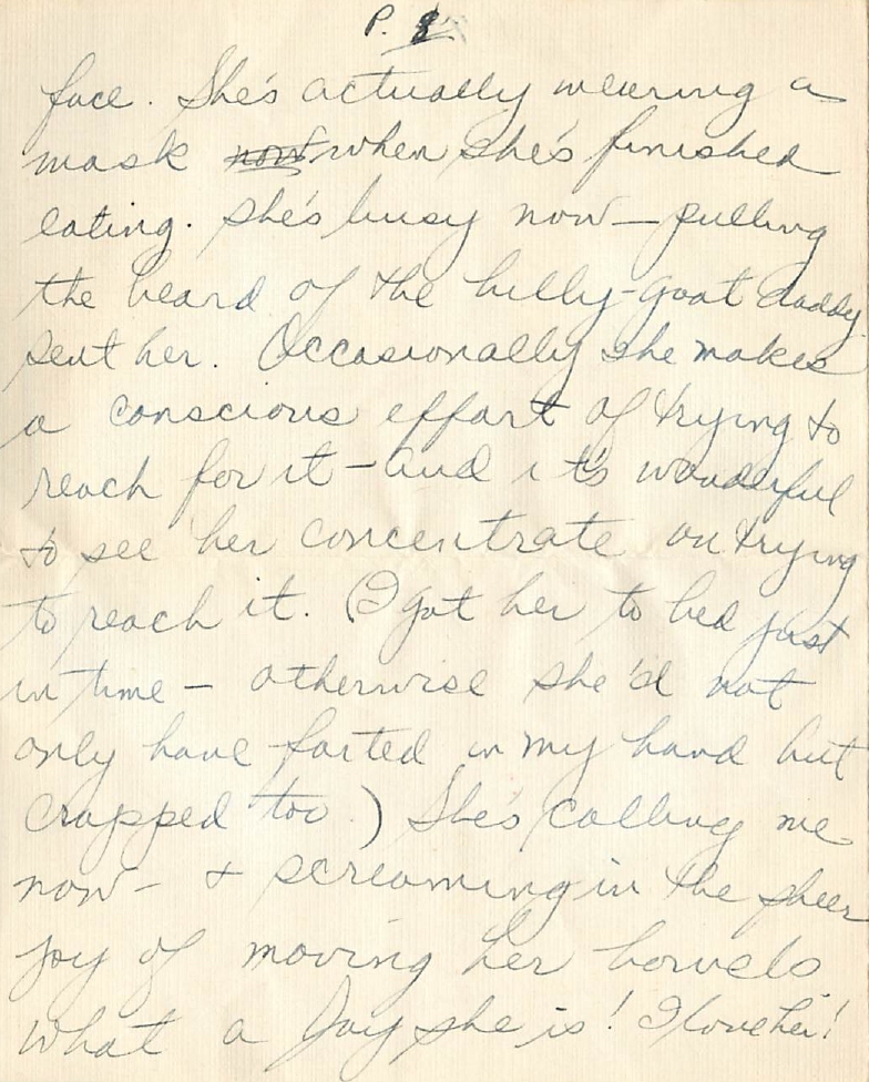 She’s actually wearing a mask when she’s finished eating. She’s busy now – pulling the beard of the billy-goat daddy sent her. Occasionally she makes a conscious effort of trying to reach for it – and it’s wonderful to see her concentrated on trying to reach it. (I got her to bed just in time – otherwise she’d not only have farted in my hand but crapped too.) She’s calling me now – and screaming in the sheer joy of moving her bowels. What a joy she is! I love her!