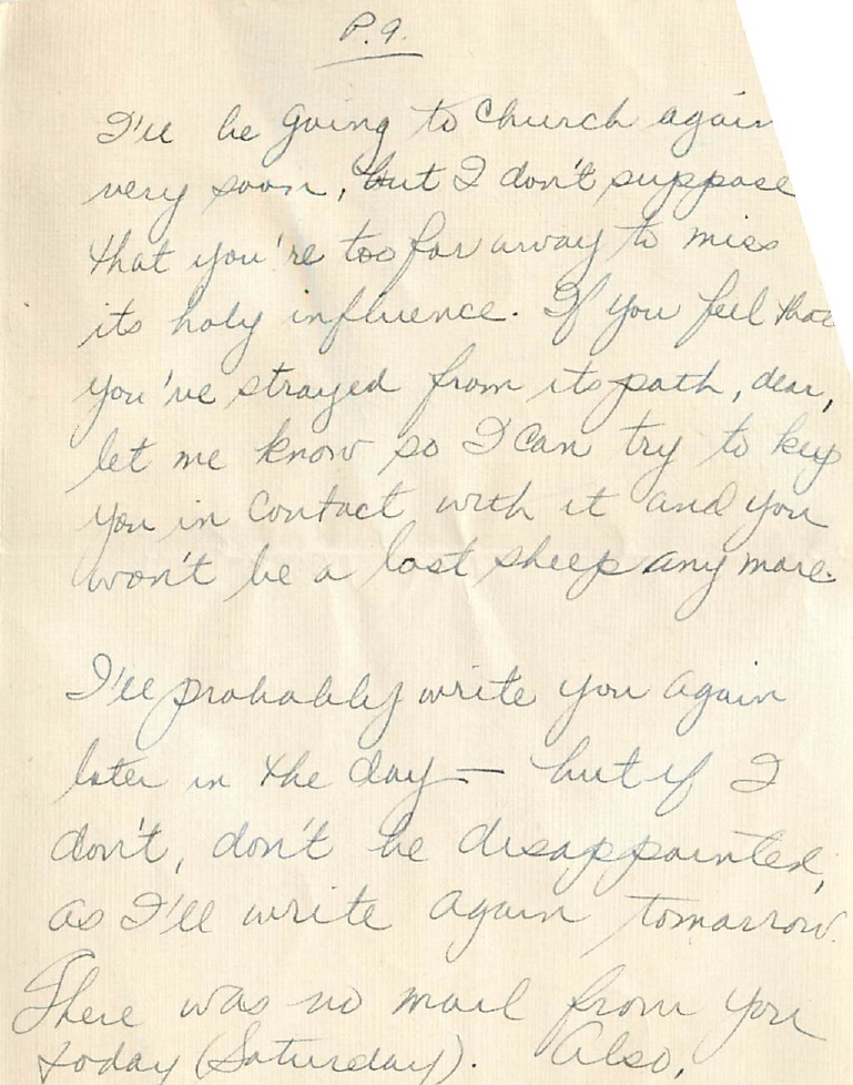 I’ll be going to church again very soon, but I don’t suppose that you’re too far away to miss its holy influence. If you feel that you’ve strayed from its path, dear, let me know so I can try to keep you in contact with it and you won’t be a lost sheep anymore.