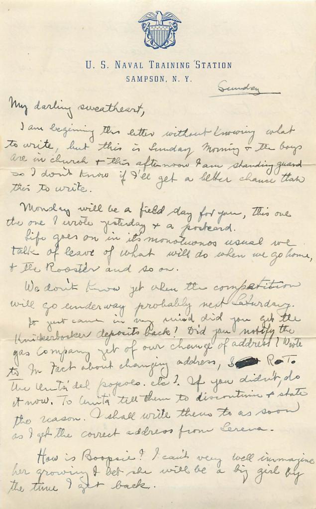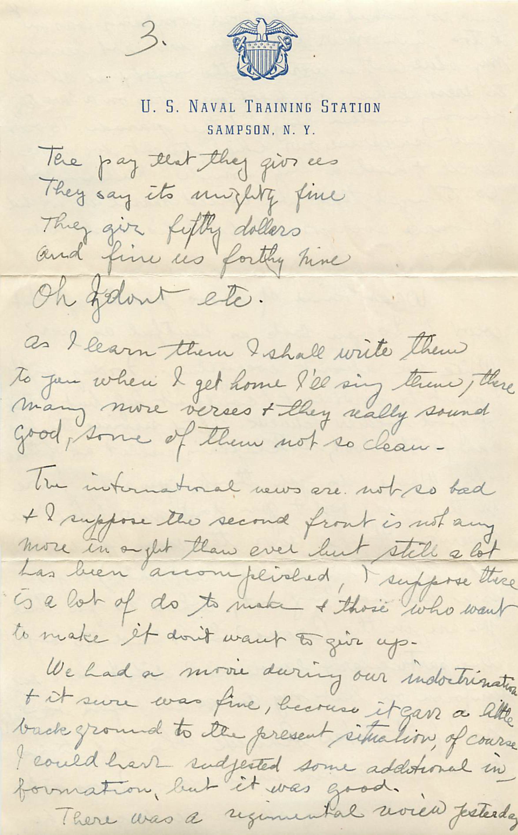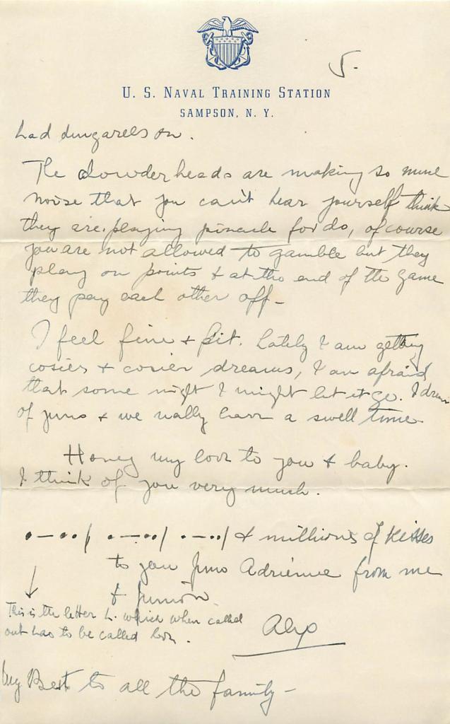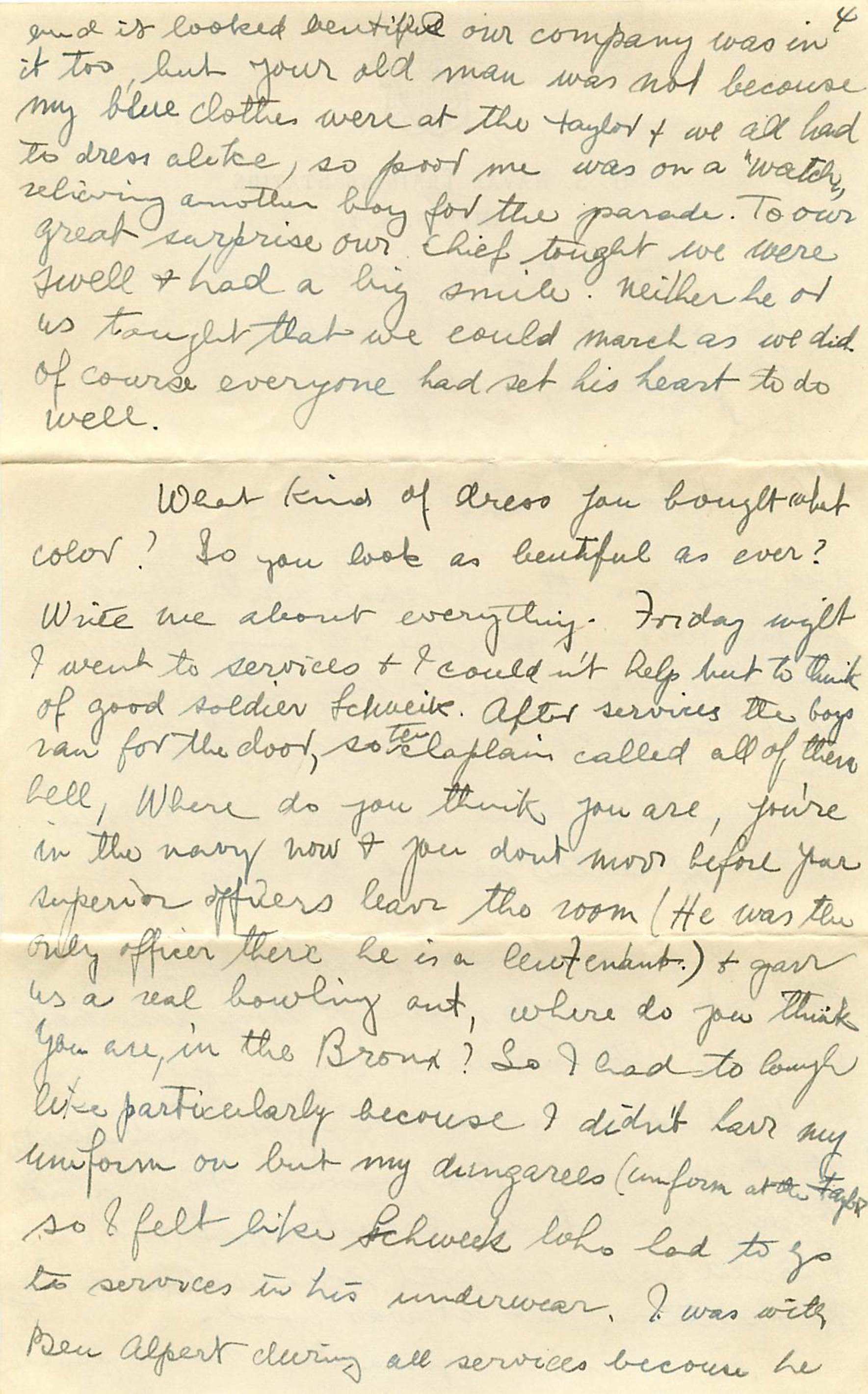 What kind of dress you bought, what color? So you look as beautiful as ever? Write me about everything. Friday night I went to services and I couldn’t help but to think of good soldier Schweik. After services the boys ran for the door, so the chaplain called all of them hell, Where do you think you are, you’re in the Navy now and you don’t move before your superior officers leave the room (He was the only officer there he is a lieutenant.) and gave us a real bawling out, where do you think you are, in the Bronx? So I had to laugh, like particularly because I didn’t have my uniform on but my dungarees (uniform at the tailor) so I felt like Schweik who had to go to services in his underwear. I was with Ben Alpert cheering all services because he