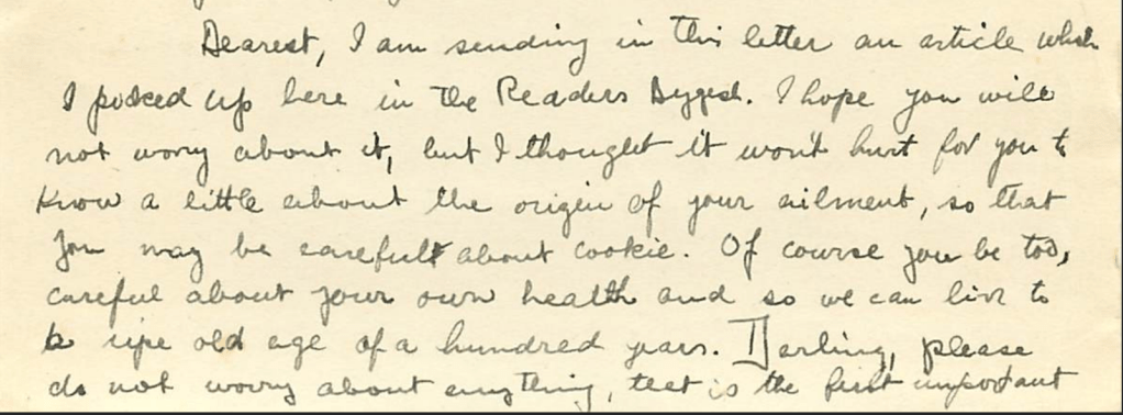 He also included, in this letter, an article from Readers Digest, writing, “I hope you will not worry about it, but I thought it won’t hurt for you to know a little about the origin of your ailment, so that you may be careful about Cookie.”