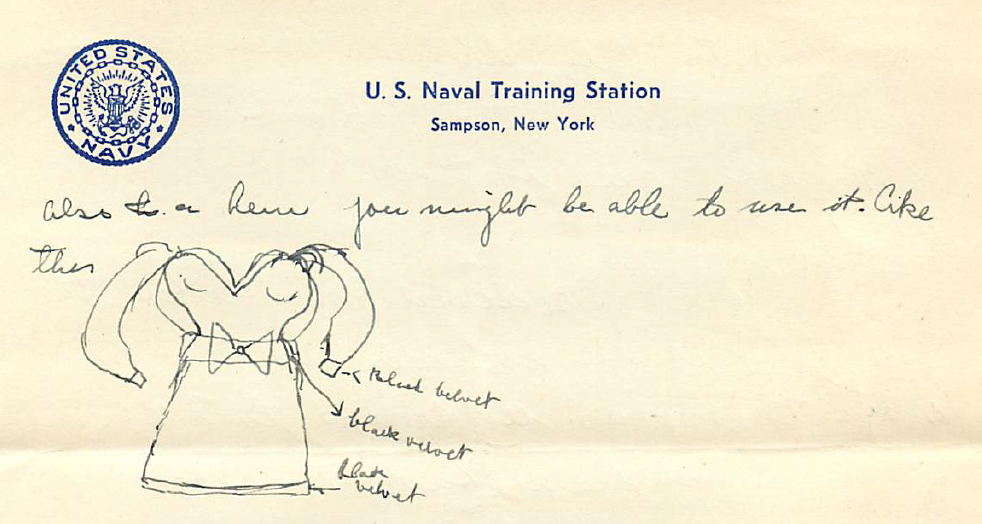 Darling I was busy till now. They taught us how to make knots I shall tell you about in another letter. I stood my watch till 8PM. I washed my clothes and here I am racing against time. In a short while lights out. IDear, the above design was all thought about last night. Of course now I realize, thinking it over that the dress is made in one piece. Well, anyway, you may see how much in detail I think of you. If you are puzzled I”ll explain my nights day-dream when I’ll see you. We received the yellow fever shot and as you see it doesn’t bother me at all.