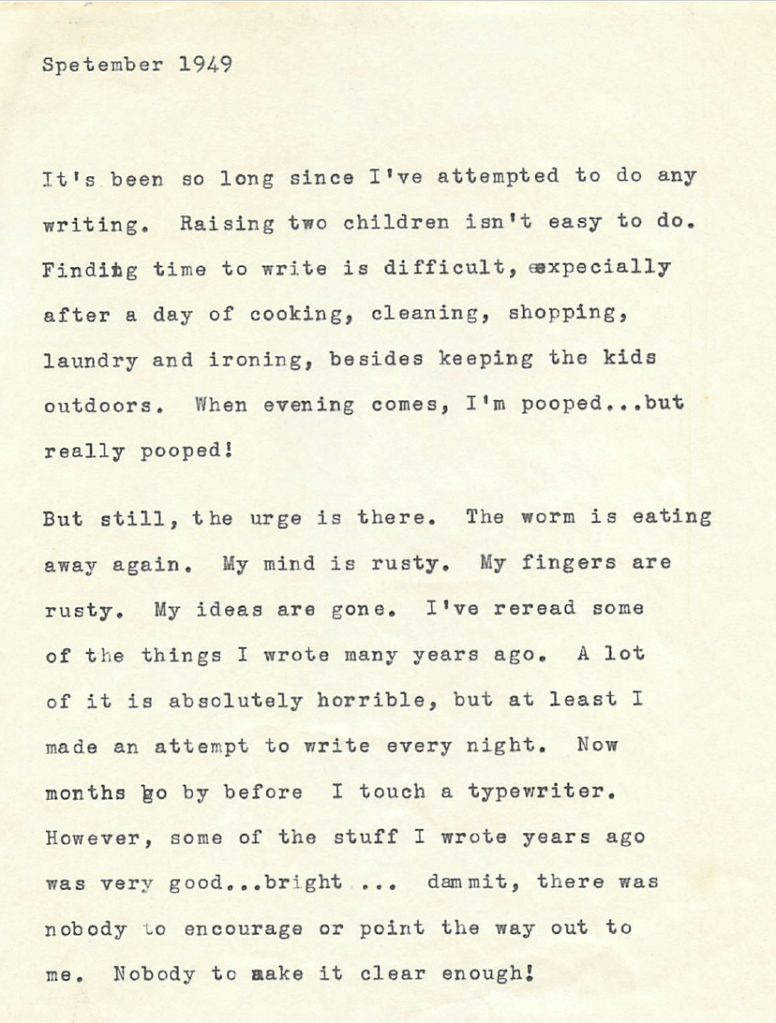 Sylvia wrote this to an editor who had reviewed a manuscript she wrote for a children’s book in 1949. It’s a project she never got to see through to fruition but we glimpse her ambition here, her oh-so-relatable attempt to balance her ideas and goals with motherhood: It’s been so long since I’ve attempted to do any writing. Raising two children isn’t easy to do. Finding time to write is difficult… When evening comes, I’m pooped… but really pooped! But still, the urge is there. The worm is eating away again. My mind is rusty. My fingers are rusty. My ideas are gone. I’ve reread some of the things I wrote many years ago. A lot of it is absolutely horrible, but at least I made an attempt to write every night. Now, months go by before I touch a typewriter. However, some of the stuff I wrote years ago was very good…bright, bright… dammit, there was nobody to encourage or point the way out to me. Nobody to make it clear enough!
